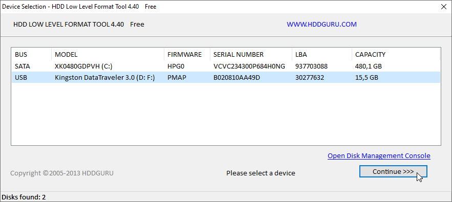 - Selecteer het juiste opslag apparaat, (je USB stick) en klik op de "Continue >>>" button. Zorg dat je je niet vergist, want het apparaat dat je hier selecteert gaat volledig gewist worden.
