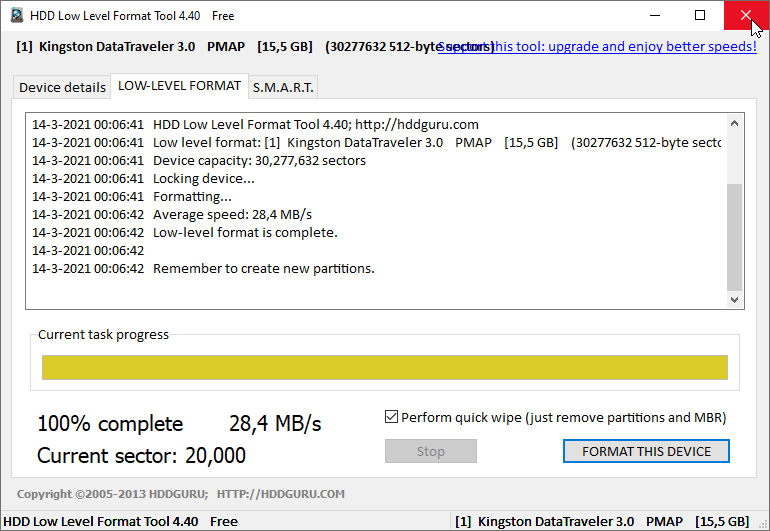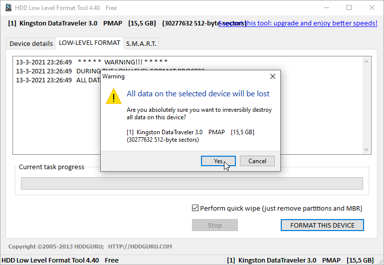 - Selecteer de middelste tab (LOW-LEVEL FORMAT), zet een vinkje bij de optie "Perform quick wipe" en klik op de "FORMAT THIS DEVICE" button.