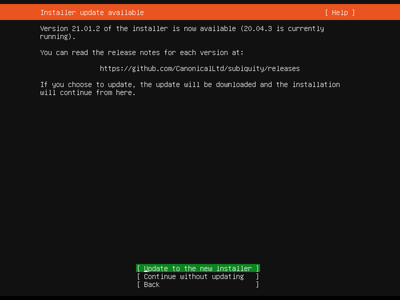 Selecteer onder in het scherm m.b.v. de cursor toetsen Update to the new installer en geef Enter. De nieuwe installer wordt nu opgehaald en wordt verder gebruikt.
