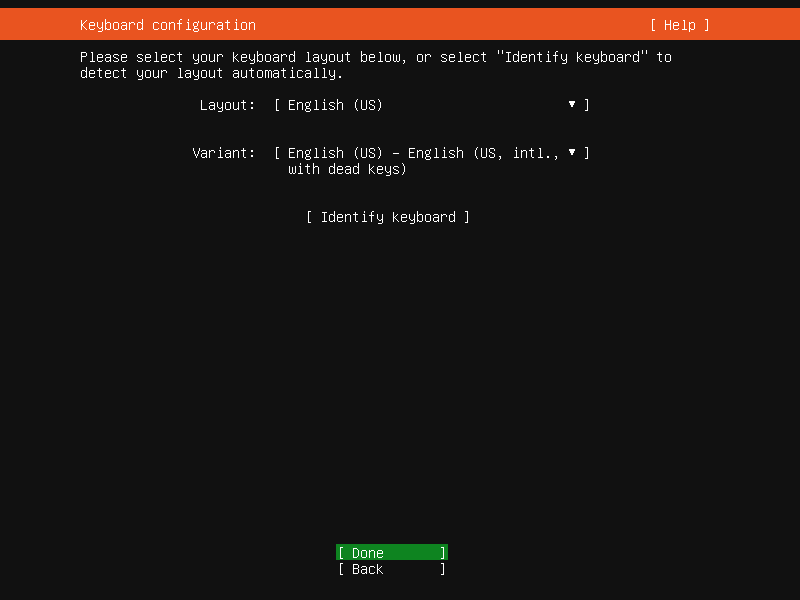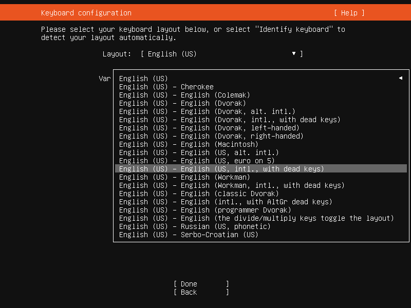 - Vervolgens verschijnt het keyboard configuration scherm. Selecteer English (US) als layout en English (US) – English (US, Intl., with dead keys) als variant. Selecteer vervolgens onder in het scherm Done en geef Enter.