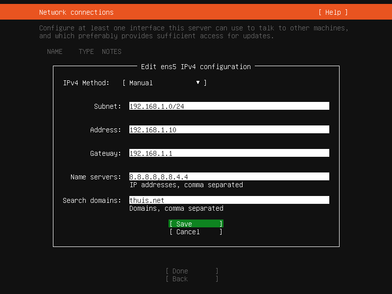 Search domains: thuis.net (De domeinnaam zoals we die thuis in huis hebben.) - Selecteer Save en geef Enter. Je komt nu weer terug in het Network connections scherm. Onder ens5 eth staat nu static 192.168.1.10/24.