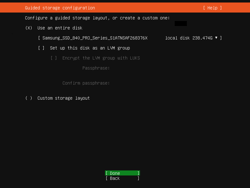 - Je komt nu in het Storage configuration scherm dat er, als het goed is, uitziet zoals het middelste plaatje hieronder. Selecteer Done en geef Enter.