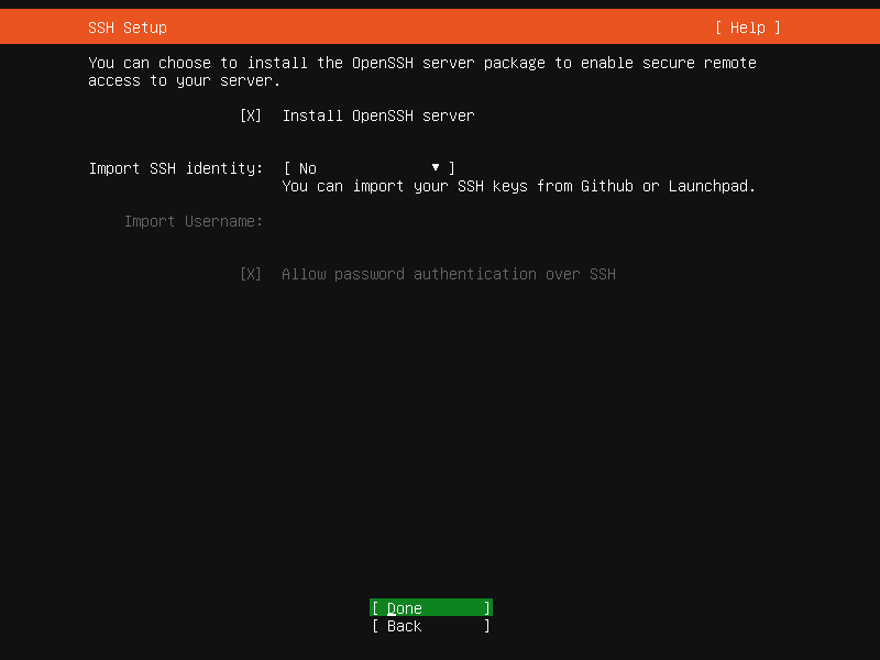 Selecteer Done en geef Enter. - Je komt nu in het SSH Setup scherm.