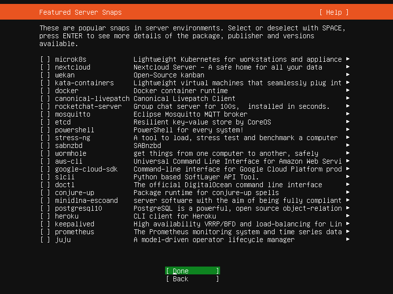 Selecteer [x] Install OpenSSH server, selecteer vervolgens Done en geef Enter. - Selecteer niets in het Featured Server Snaps scherm, maar tab naar Done en geef Enter.