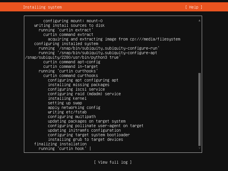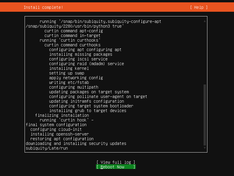 - Selecteer, wanneer de installatie gereed is, “Reboot” om de server te herstarten.