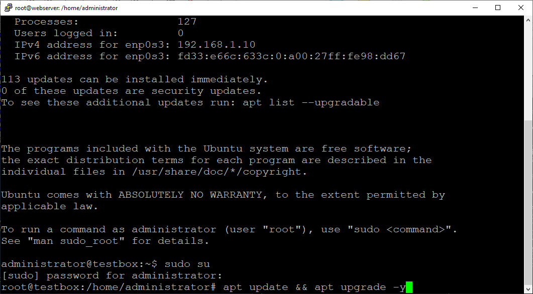 Nadat de serverlaptop weer is opgestart melden we aan met de gebruikersnaam en wachtwoord die tijdens de installatie zijn aangemaakt. Je kunt dit aan de laptop zelf doen, maar je kunt ook PuTTY gebruiken om m.b.v. SSH te verbinden naar het IP adres van de server laptop. Na het aanmelden gaan we eerst alle updates installeren.