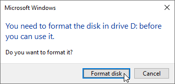When inserting the USB stick, you may receive a message like the one below stating that it needs to be formatted. You can ignore this message.