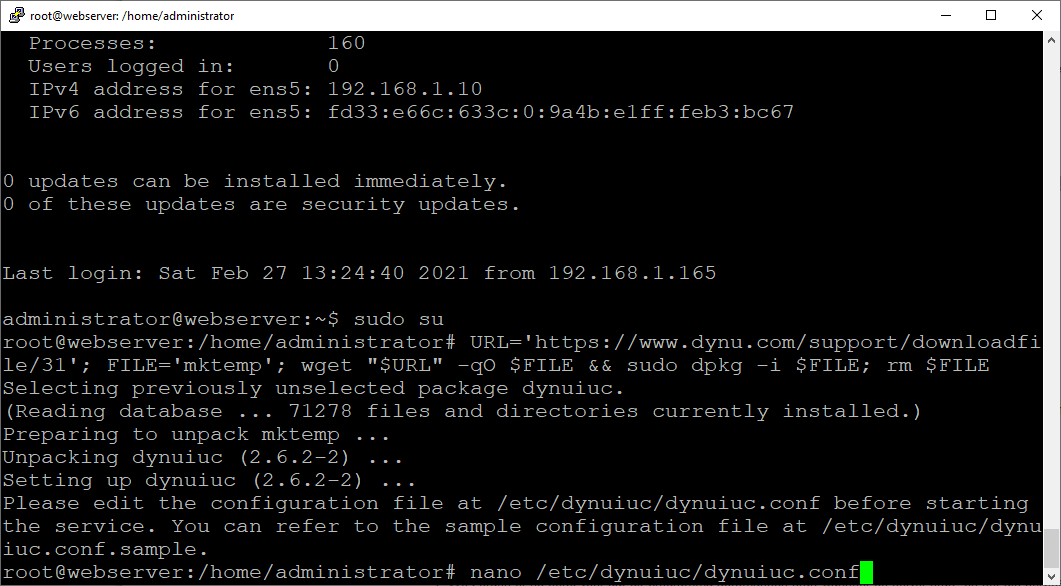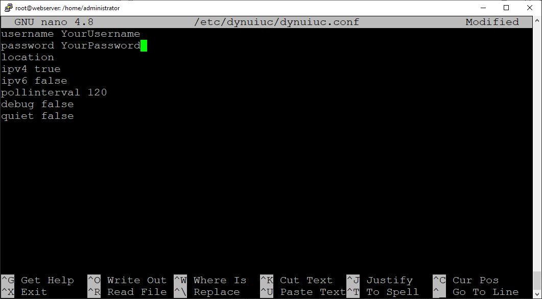 nano /etc/dynuiuc/dynuiuc.conf- Voeg achter "username" je Dynu gebruikersnaam toe.