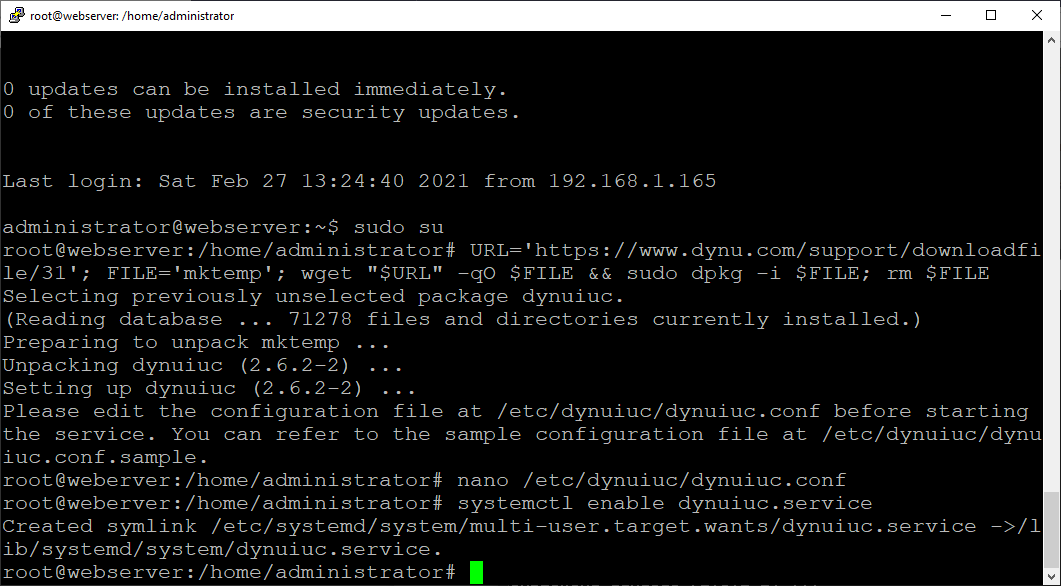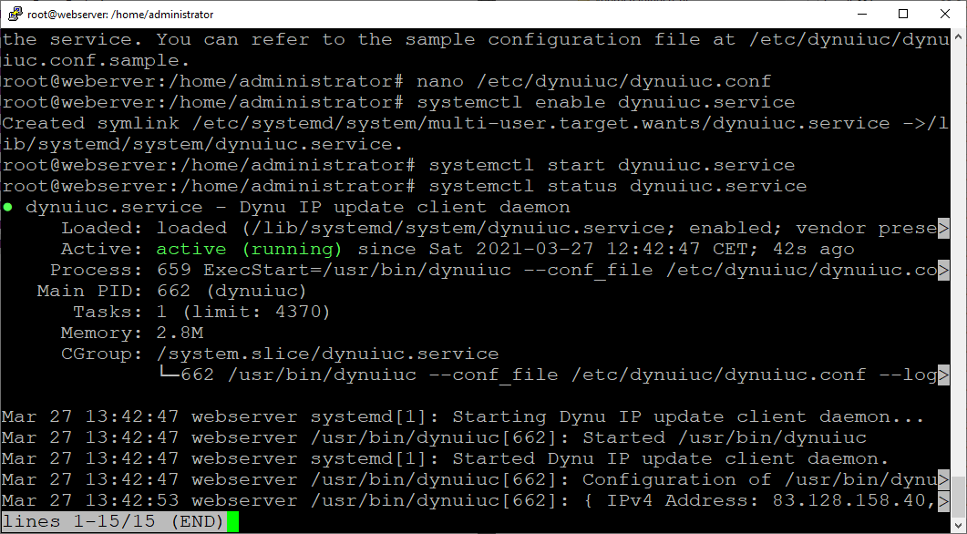 systemctl enable dynuiuc.service - We starten nu de service met het commando: