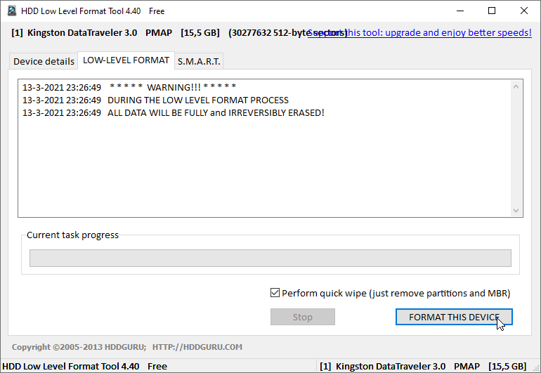 - Selecteer de middelste tab (LOW-LEVEL FORMAT), zet een vinkje bij de optie "Perform quick wipe" en klik op de "FORMAT THIS DEVICE" button.