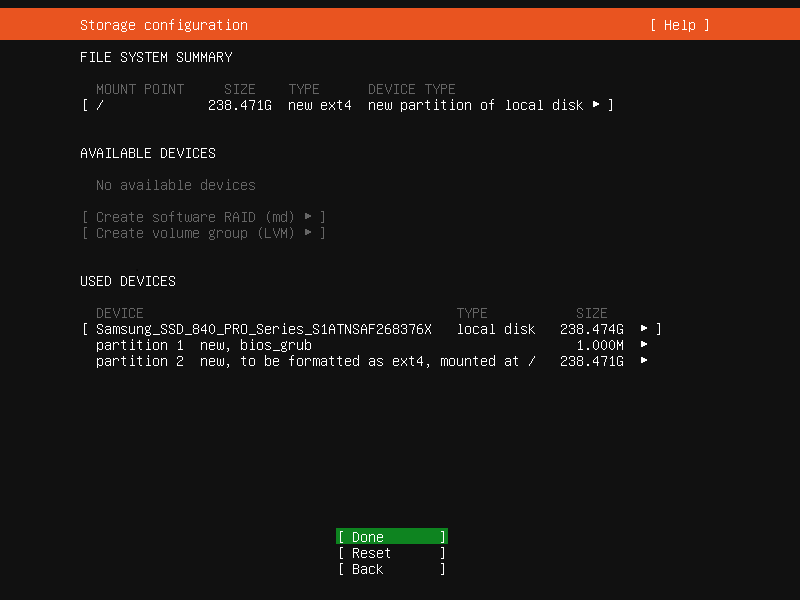 - Je komt nu in het Storage configuration scherm dat er, als het goed is, uitziet zoals het middelste plaatje hieronder. Selecteer Done en geef Enter.