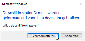 Het kan zijn dat je bij het plaatsen van de USB stick een mededeling zoals hieronder krijgt dat hij geformatteerd moet worden. Deze mededeling kun je negeren.