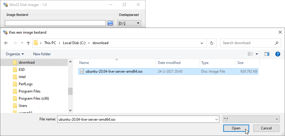 De software die we gebruiken om de bootable USB stick te maken is Win32DiskImager. Je kunt een installer downloaden en de software op je PC installeren maar dat is niet echt nodig. Je kunt ook de z.g. binary release downloaden. Dat is een ZIP bestand dat je kan uitpakken waarna je de software kan gebruiken zonder dat je het hoeft te installeren. Je kan de binary release downloaden van: