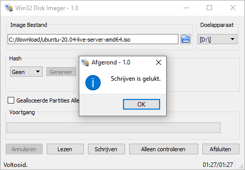 - Als het schrijven gelukt is kan het programma worden gesloten en de USB stick veilig worden verwijderd.