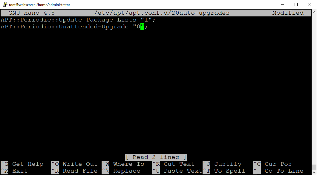 Omdat we graag zelf in de hand hebben wanneer de updates worden geïnstaleerd willen we niet dat dit automatisch gebeurt. Dit kunnen we regelen in het bestand ‘/etc/apt/apt.conf.d/20auto-upgrades’. We openen dit bestand weer in nano: