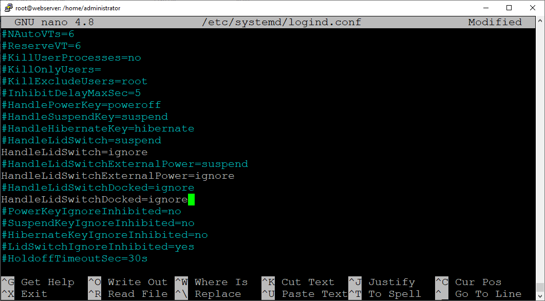 Om ervoor te zorgen dat de server laptop altijd aan blijft staan, ook als we de laptop dicht klappen, moeten we het bestand ‘/etc/systemd/logind.conf’ aanpassen. We geven dus nu het commando: