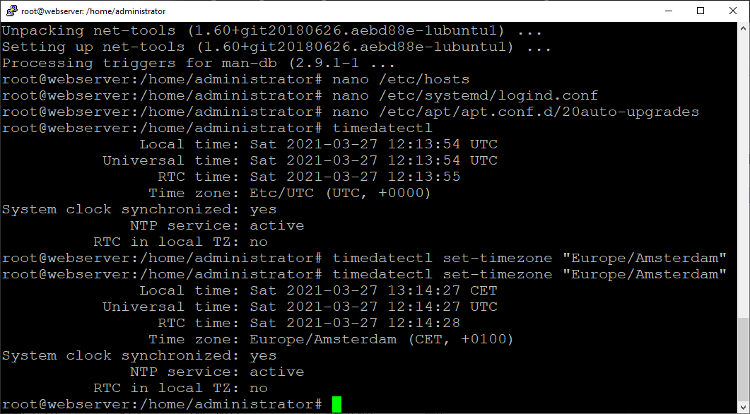 We controleren hierna of de tijdzone goed staat door weer het commando te geven: