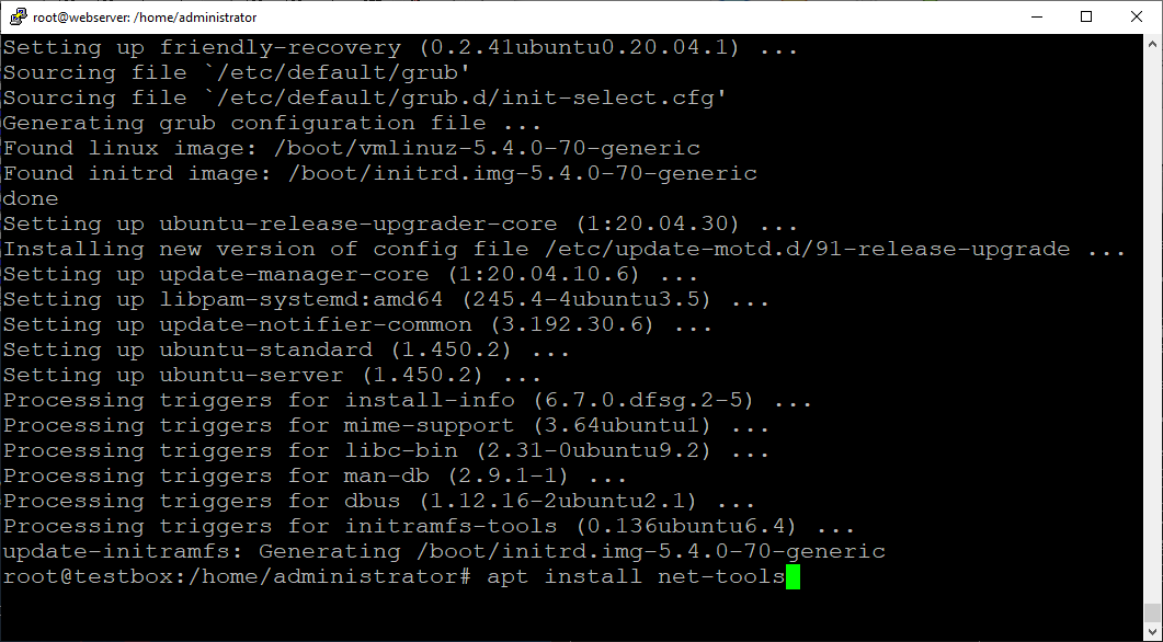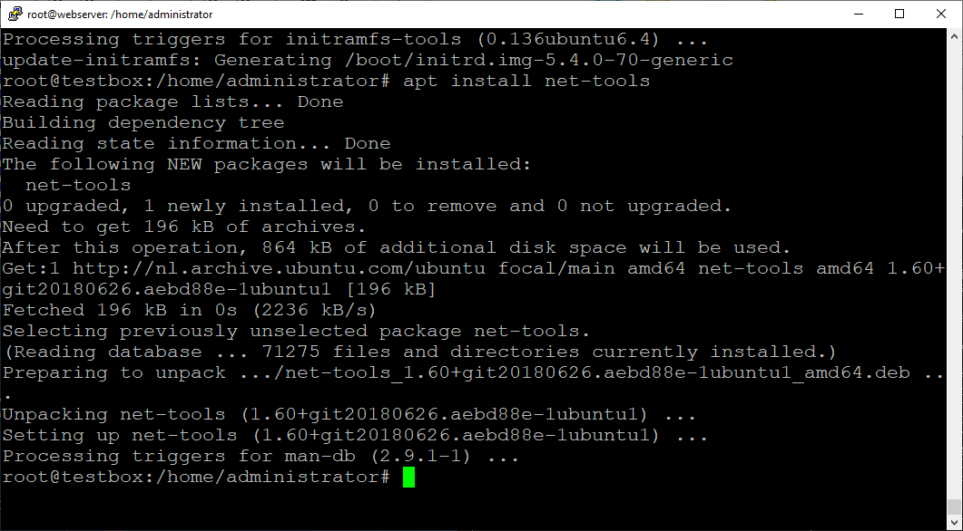 Nadat de updates zijn geïnstalleerd gaan we ook nog even het net-tools pakket installeren. Dat gaat ook met de apt packet manager met het commando: